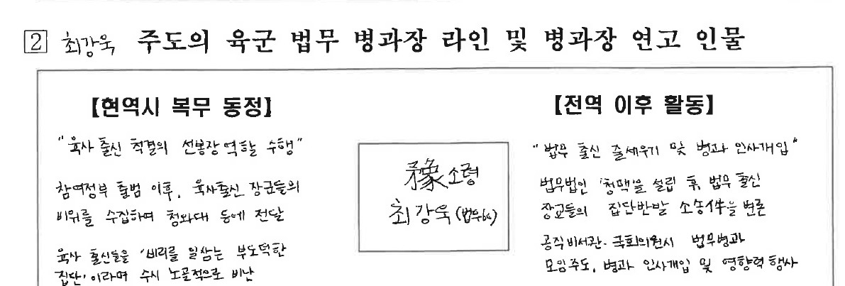 전역 후 활동에는 "법무 출신 줄세우기 및 병과 인사개입", "법무법인 '청맥'을 설립 후 법무 출입 장교들의 집단반발 소송건 변론", "공직비서관·국회의원시 법무병과 모임 주도, 병과 인사개입 및 영향력 행사" 등 내용이 적혔다.