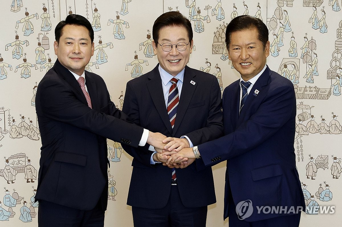 (서울=연합뉴스) 한상균 기자 = 이재명 대통령이 지난해 9월 8일 용산 대통령실에서 여야 지도부 오찬 회동에 참석한 더불어민주당 정청래 대표, 국민의힘 장동혁 대표와 기념촬영을 하고 있다. 2025.9.8 [대통령실통신사진기자단] xyz@yna.co.kr