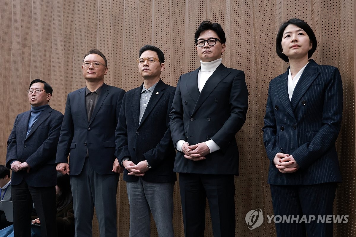 (서울=연합뉴스) 신현우 기자 = 국민의힘 한동훈 전 대표가 13일 국회 소통관에서 배현진 의원의 당원권 정지 1년 처분 관련 기자회견을 지켜보고 있다. 왼쪽부터 국민의힘 유용원·안상훈·박정훈 의원, 한 전 대표, 한지아 의원. 2026.2.13 nowwego@yna.co.kr