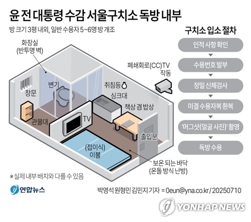 윤 전 대통령이 머무는 방 내부에는 싱크대를 제외한 관물대, TV, 책상 겸 밥상, 식기, 변기가 있는 것으로 전해졌다.