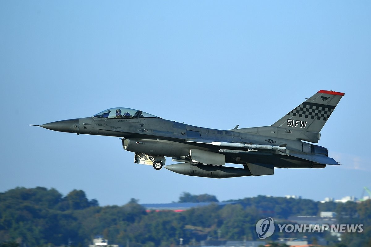 (서울=연합뉴스) 3일 서울 용산 합동참모본부에서 열린 연합 편대비행을 공중에서 존 대니얼 케인 미국 합참의장이 탑승한 주한미군 F-16 전투기가 이륙하고 있다. 2025.11.3 [합동참모본부 제공. 재판매 및 DB 금지] photo@yna.co.kr