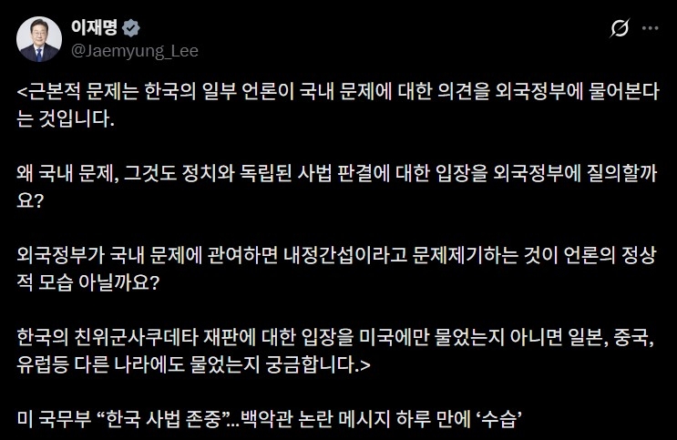 이 대통령은 이날 엑스(X·옛 트위터)에 올린 글에서 윤 전 대통령 재판에 대한 백악관 고위 관계자의 발언과 미국 국무부 입장을 다룬 기사를 공유하며 이같이 썼다.