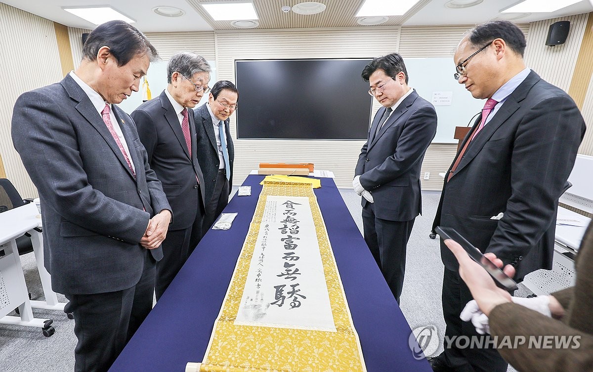 (서울=연합뉴스) 권오을 국가보훈부 장관이 지난 20일 서울 중구 안중근의사기념관에서 열린 안중근의사 유묵 전달식에서 더불어민주당 박찬대 의원, 유영렬 안중근의사기념관장, 김황식 안중근의사 숭모회 이사장등과 함께 일본 도쿄도립 로카기념관에서 6개월간 대여받은 안중근 의사 유묵을 살펴보고 있다. 2026.2.20 [국가보훈부 제공. 재판매 및 DB 금지] photo@yna.co.kr