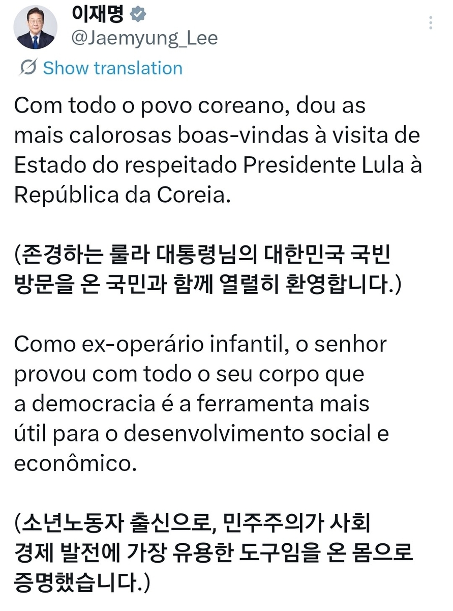 이 대통령은 이날 룰라 대통령과의 정상회담을 앞두고 엑스(X·옛 트위터)에 브라질 공식 언어인 포르투갈어와 병기해 환영 메시지를 올려 이같이 말했다.