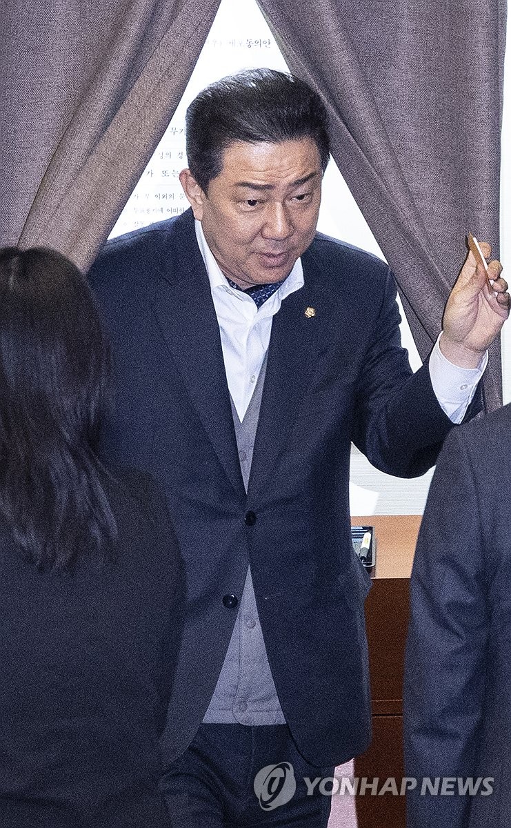 (서울=연합뉴스) 황광모 기자 = 무소속 김병기 의원이 24일 국회에서 열린 본회의에 참석해 1억원의 공천헌금을 주고받은 혐의로 수사를 받는 무소속 강선우 의원에 대한 체포동의안 기표를 마친 뒤 기표소를 나오고 있다. 2026.2.24 hkmpooh@yna.co.kr