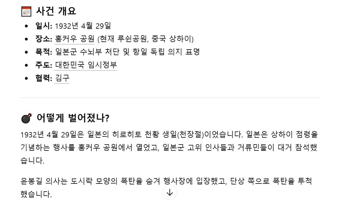 실제로 챗GPT에 훙커우 공원 의거에 대해 질문하면 '1932년 윤봉길 의사가 일제 주요 인사를 향해 도시락 모양의 폭탄을 던진 사건'이라 답한다. 하지만 당시 윤 의사가 던진 건 도시락이 아니라 물통 모양 폭탄이었다. 다시 확인해보라는 요청에 답변은 '사실 물통 모양이었다'고 정정됐다.