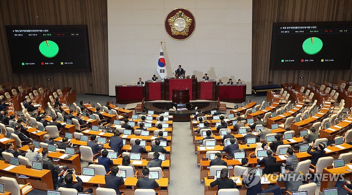 (서울=연합뉴스) 황광모 기자 = 26일 국회에서 열린 2월 임시국회 8차 본회의에서 전날 상정된 형법 개정안 수정안(법왜곡죄)이 여당 주도로 통과되고 있다. 2026.2.26 hkmpooh@yna.co.kr