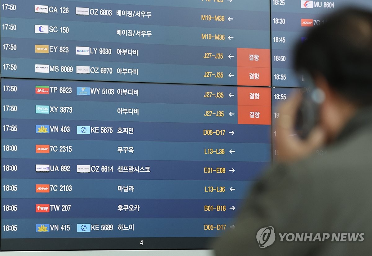 (영종도=연합뉴스) 서명곤 기자 = 3일 인천국제공항 제1터미널 체크인카운터 전광판에 아랍에미리트(UAE) 아부다비행 여객기가 결항으로 표시돼있다. 2026.3.3 seephoto@yna.co.kr