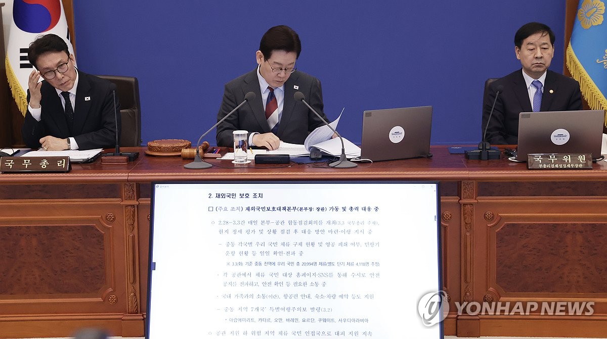 (서울=연합뉴스) 김도훈 기자 = 이재명 대통령이 5일 청와대에서 열린 국무회의에서 외교부의 중동 상황 관련 대응 현황 및 계획 관련 부처보고를 받고 있다. 2026.3.5 superdoo82@yna.co.kr