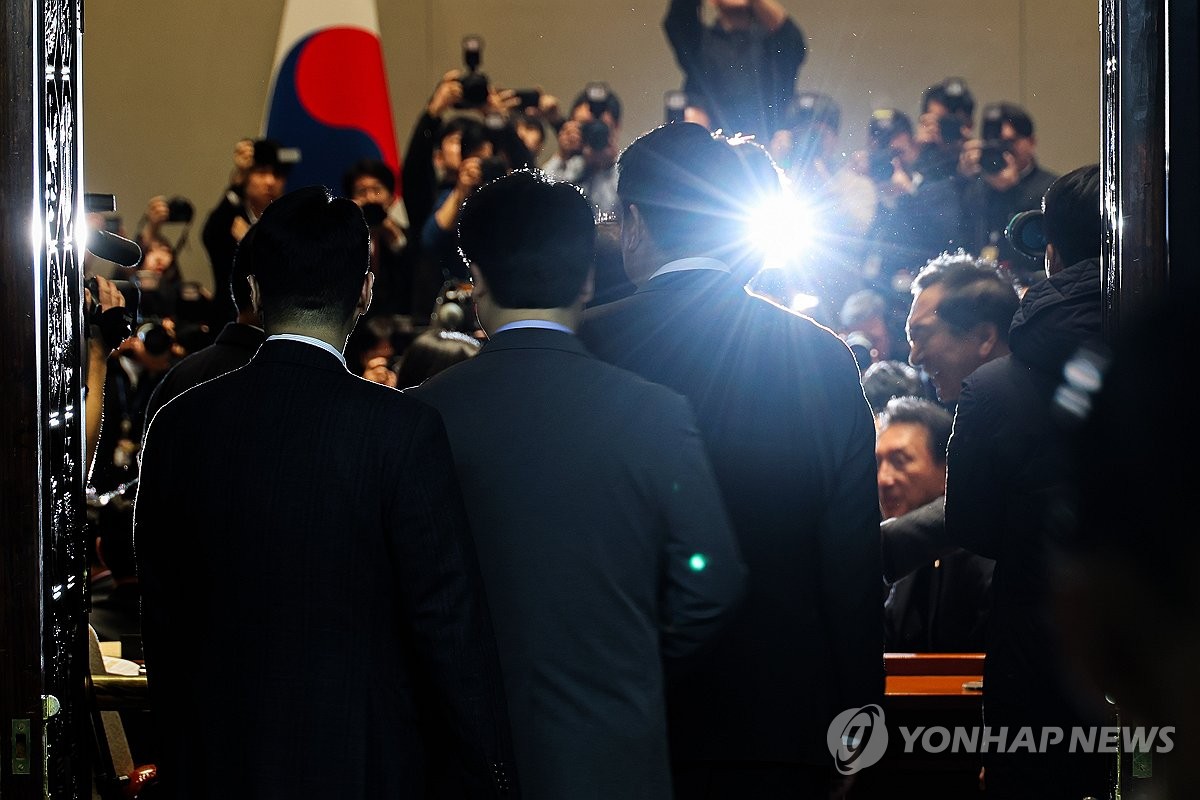 (서울=연합뉴스) 이동해 기자 = 국민의힘 장동혁 대표와 송언석 원내대표 등 지도부가 9일 국회에서 열린 긴급 의원총회에 참석하고 있다. 2026.3.9 eastsea@yna.co.kr