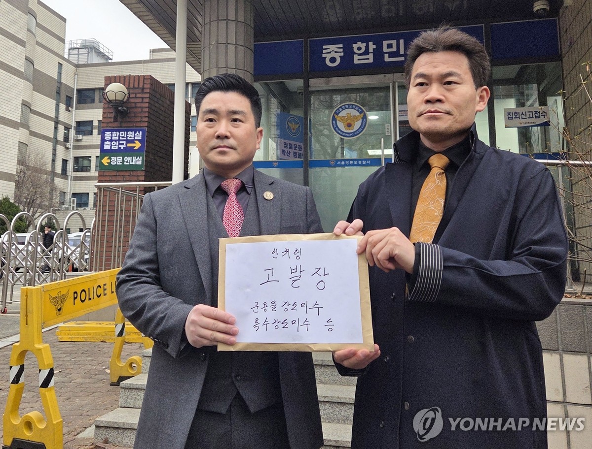 (서울=연합뉴스) 박수현 기자 = 한국사 강사 출신 유튜버 전한길 씨와 김현태 전 육군 특수전사령부 707특수임무단장(대령)이 24일 서울 영등포경찰서 민원실 앞에서 안귀령 대통령실 부대변인에 대한 고발장을 들어 보이고 있다. 2026.2.24 suri@yna.co.kr