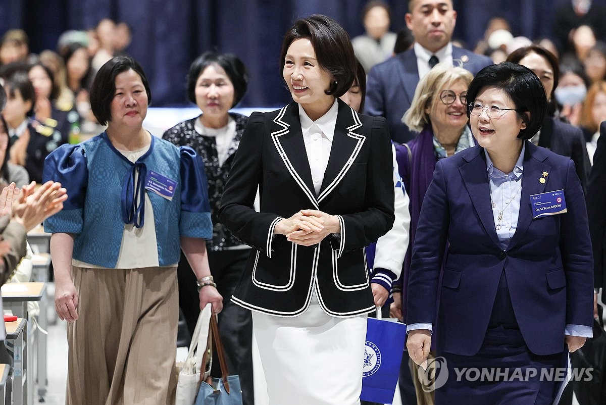 (서울=연합뉴스) 김도훈 기자 = 김혜경 여사가 11일 서울 용산구 숙명여자대학교에서 열린 세계여성의날 기념 숙명국제포럼에 입장하고 있다. 2026.3.11 [청와대통신사진기자단] superdoo82@yna.co.kr