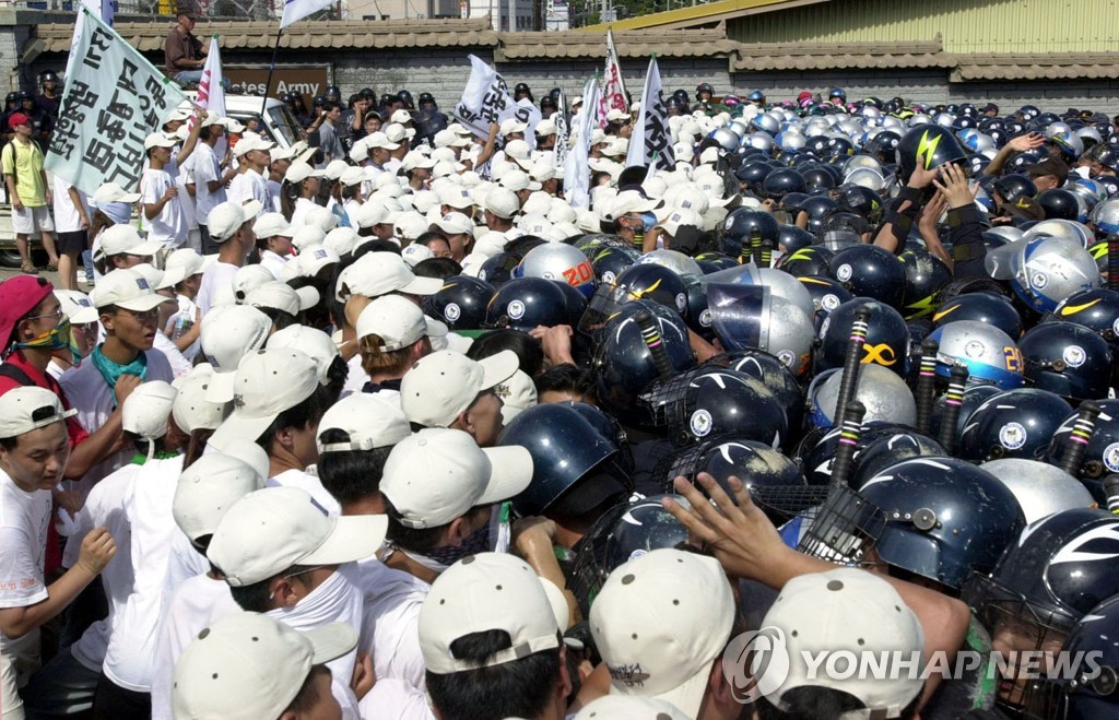 2000년 8월5일 오후 부산시 부산진구 연지동 미군 하얄리야 부대 정문 앞에서 한총련 통일선봉대 소속학생 1천여명이 주한미군 철수 등을 주장하며 경찰과 몸싸움을 벌이고 있다 [연합뉴스 사진]