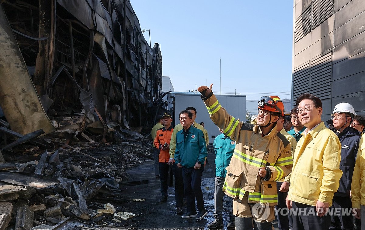 (대전=연합뉴스) 김준범 기자 = 이재명 대통령이 21일 대전 대덕구 안전공업 건물의 대형 화재 현장을 찾아 피해 상황을 살펴보고 있다. 2026.3.21 [공동취재] psykims@yna.co.kr