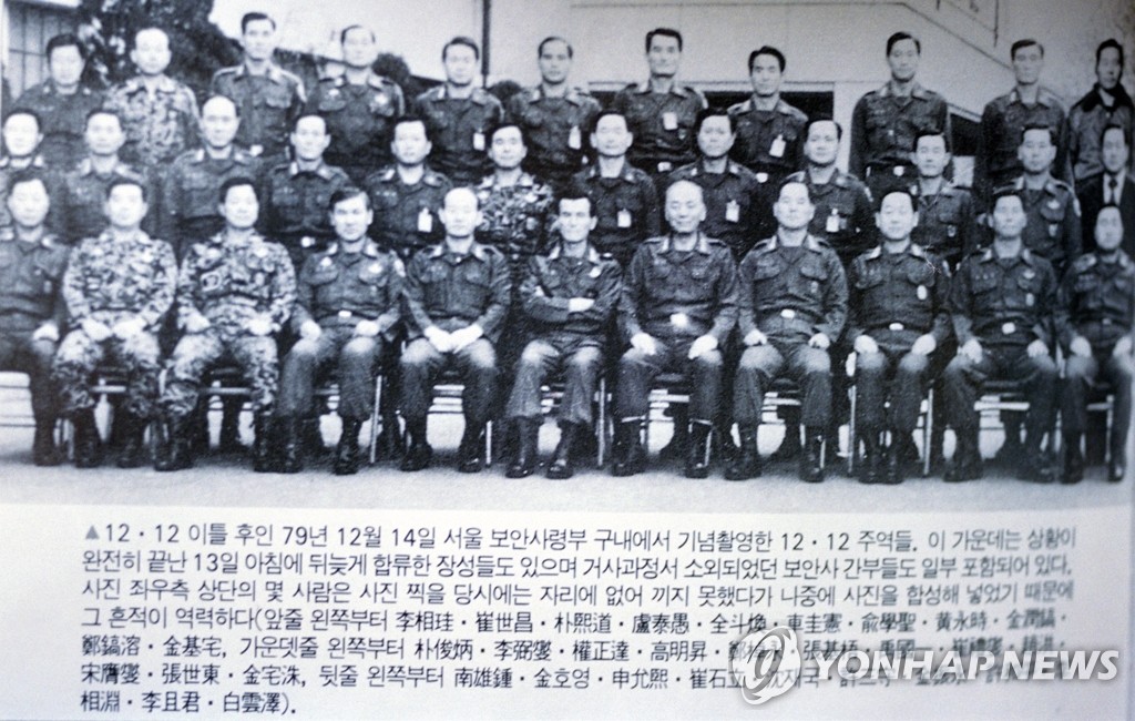 (서울=연합뉴스) 오는 12일은 1979년 신군부의 12.12 쿠데타 31년째이다. 12.12 쿠데타에 이어 1980년 광주민주화항쟁까지 무력 진압하면서 차례로 정권을 잡았던 전두환, 노태우 전 대통령은 김영삼 정부 시절 무기징역과 징역 17년형을 선고받았다. 사진은 1979년 12월 14일 서울 보안사령부에서 기념촬영한 12.12 주역들 모습이다. 이 가운데에는 상황이 완전히 끝난 13일 아침에 뒤늦게 합류한 장성들도 있으며 거사과정서 소외되었던 보안사 간부들도 일부 포함되어 있다. 2010.12.11 <<연합뉴스 DB>> photo@yna.co.kr