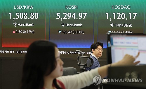 코스피, 3% 하락해 5,300선 아래로…코스닥도 1.6% 내려