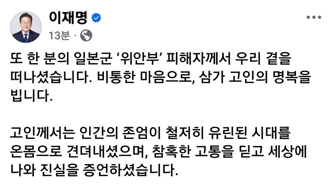 (서울=연합뉴스) 임형섭 기자 = 이재명 대통령은 29일 일본군 '위안부' 피해자 A씨가 전날 별세한 것에 대해 "비통한 마음으로 삼가 고인의 명복을 빈다"며 "모든 집을 내려놓으시고 부디 평온하시길 온 마음으로 기원한다"고 말했다.