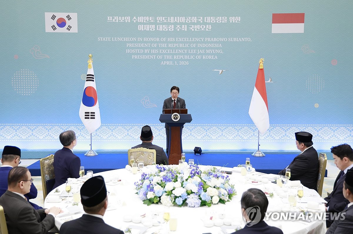 (서울=연합뉴스) 한상균 기자 = 이재명 대통령이 1일 청와대에서 열린 프라보워 수비안토 인도네시아 대통령 국빈 방한 환영 오찬에서 환영사를 하고 있다. 2026.4.1 xyz@yna.co.kr