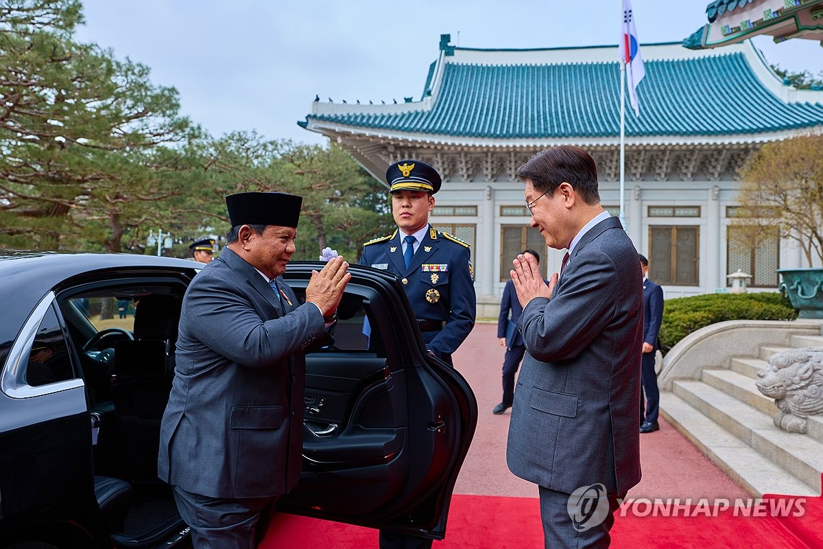 (서울=연합뉴스) 이재명 대통령이 1일 청와대에서 국빈 방한한 프라보워 수비안토 인도네시아 대통령을 영접하고 있다. 2026.4.1 [청와대 제공. 재판매 및 DB 금지] photo@yna.co.kr