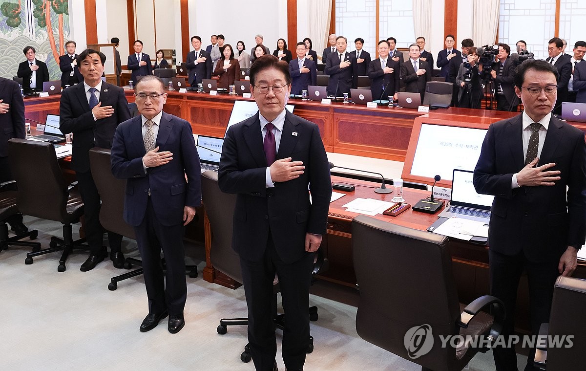 (서울=연합뉴스) 한상균 기자 = 이재명 대통령이 9일 청와대에서 열린 수석보좌관회의에서 국기에 경례하고 있다. 2026.4.9 xyz@yna.co.kr