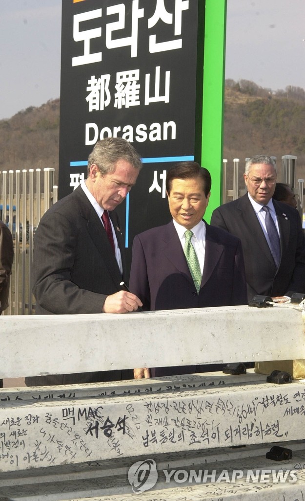 (서울=연합뉴스) 2002년 2월 20일 오후 경의선종착역인 도라산역을 방문한 부시미대통령이 침목에 서명하는 것을 김대중대통령이 지켜보고 있다. 2009.8.18 << 연합뉴스 자료사진 >>
