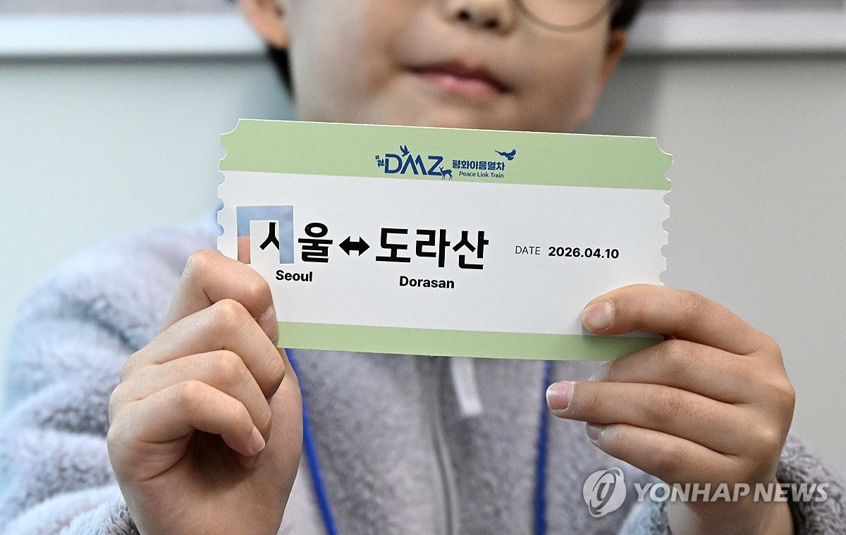 (서울=연합뉴스) 신준희 기자 = 10일 서울역에서 운행이 재개된 DMZ 평화이음 열차에 탑승한 어린이가 열차표를 들어 보이고 있다. 2026.4.10 [공동취재] hama@yna.co.kr