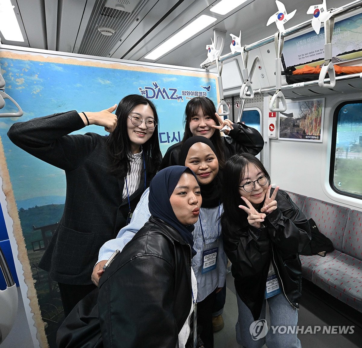 (서울=연합뉴스) 신준희 기자 = 10일 운행이 재개된 DMZ 평화이음 열차에 마련된 포토존에서 외국인 유학생 탑승객들이 기념 촬영하고 있다. 2026.4.10 [공동취재] hama@yna.co.kr