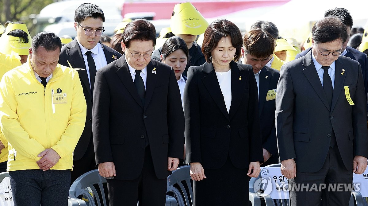 (안산=연합뉴스) 김도훈 기자 = 이재명 대통령과 김혜경 여사가 16일 경기도 안산 화랑유원지에서 열린 세월호 참사 12주기 기억식에서 묵념하고 있다. 2026.4.16 superdoo82@yna.co.kr