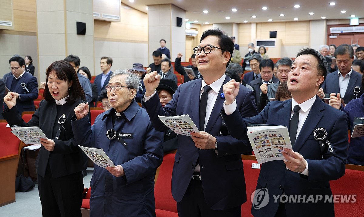 (서울=연합뉴스) 김주형 기자 = 10일 서울 동작구 국립서울현충원 현충관에서 열린 운암 김성숙 선생 제57주기 추모제에서 참석자들이 독립군가를 부르고 있다. 앞줄 왼쪽부터 강윤진 국가보훈부 차관, 함세웅 항일독립선열선양단체연합 회장, 더불어민주당 송영길 전 대표, 윤준호 전 의원. 2026.4.10 kjhpress@yna.co.kr