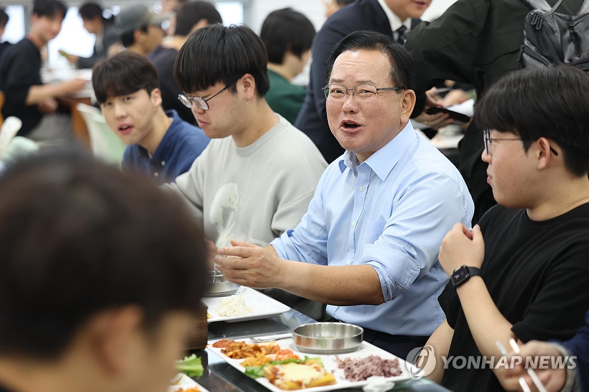 (대구=연합뉴스) 김현태 기자 = 더불어민주당 김부겸 대구시장 예비후보가 23일 오후 대구 북구 경북대학교 글로벌플라자 푸드코트에서 대학생들과 학식을 먹으며 현안 등에 대해 얘기를 나누고 있다. 2026.4.23 mtkht@yna.co.kr