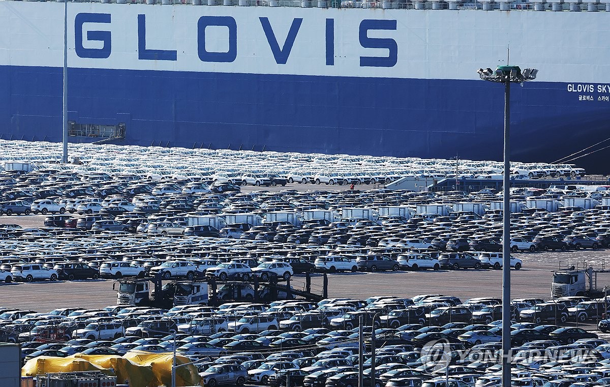 (평택=연합뉴스) 홍기원 기자 = 도널드 트럼프 미국 대통령이 한국 국회가 한미 간의 무역합의 이행에 필요한 법적 절차를 진행하지 않았다고 주장하며 한국산 제품에 대한 관세를 무역합의 이전 수준으로 다시 인상하겠다고 밝혔다. 사진은 27일 경기도 평택항에 수출용 차량이 세워져 있는 모습. 2026.1.27 xanadu@yna.co.kr
