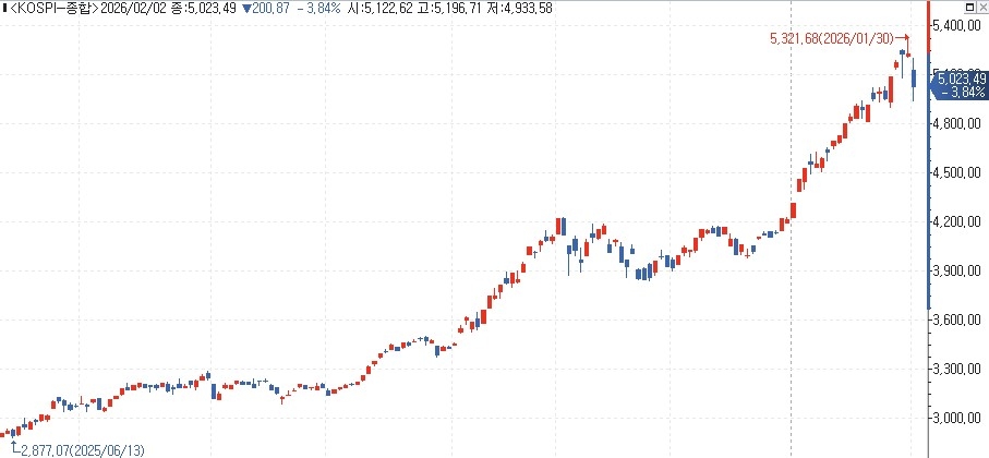 이날 낮 12시 52분 현재 코스피는 전 거래일 대비 4.94% 급락한 4,965.64에 거래되고 있다.