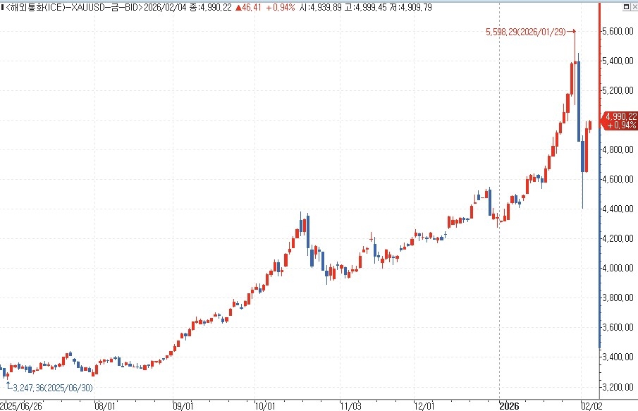 올해 4월 인도분 금 선물은 전장보다 6.1% 오른 온스당 4천935달러로 3일 거래를 끝냈고 4일 오전 8시50분 현재 4천965.00달러를 나타냈다.