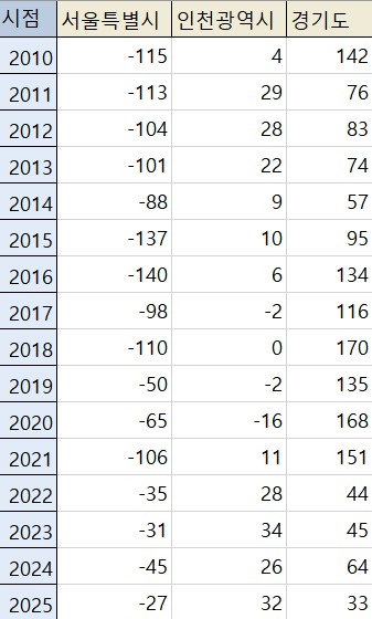 [표] 수도권(서울·인천·경기) 순이동 규모(단위: 천명)