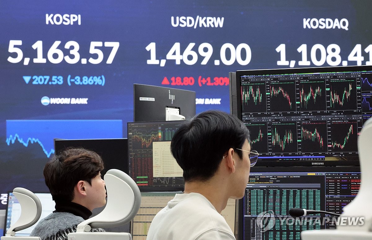 (서울=연합뉴스) 이진욱 기자 = 5일 서울 중구 우리은행 딜링룸에서 딜러들이 업무를 보고 있다. 이날 코스피 지수는 전장보다 207.53포인트(3.86%) 내린 5,163.57로 장을 마감했다. 2026.2.5 cityboy@yna.co.kr