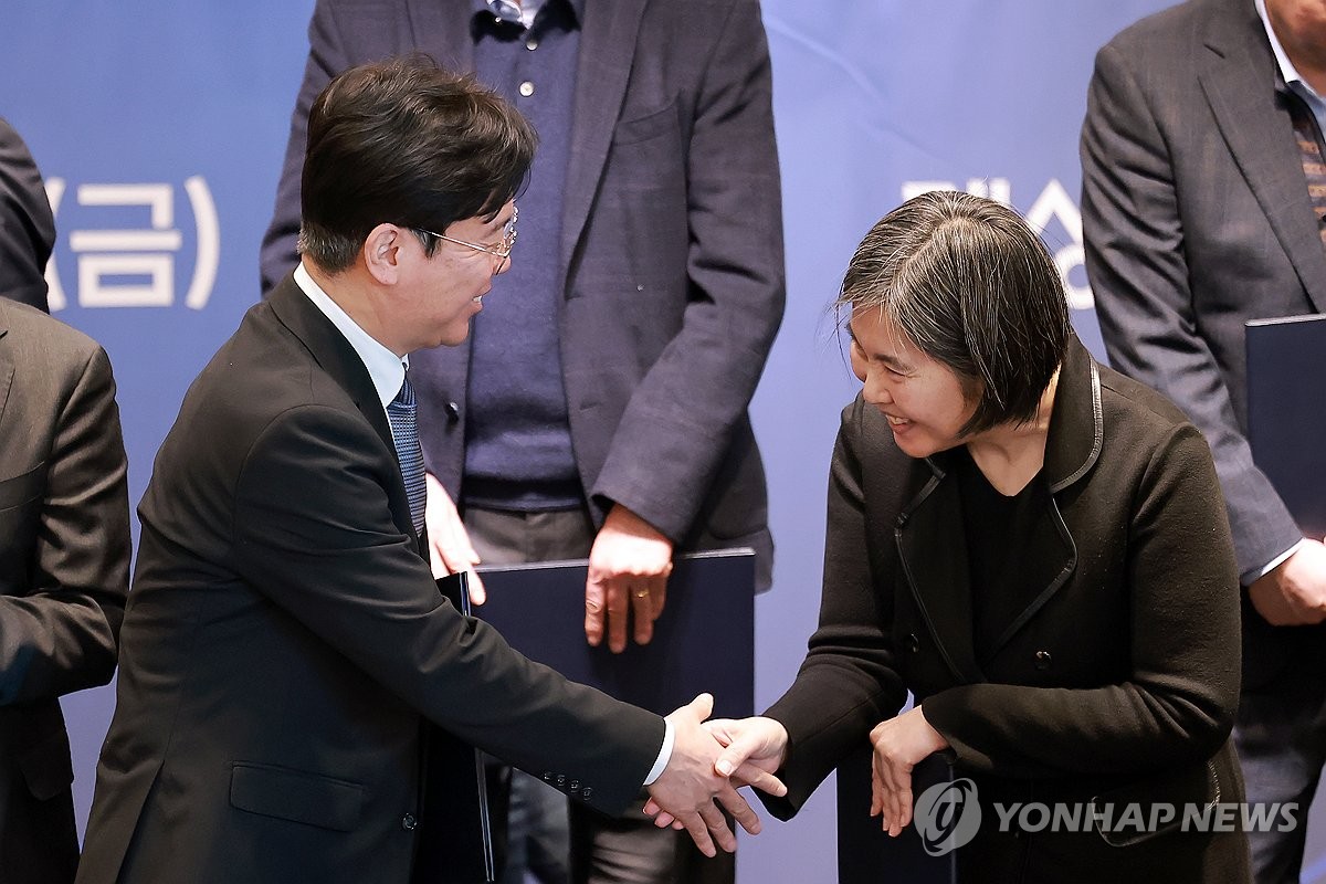 (서울=연합뉴스) 신현우 기자 = 김영훈 고용노동부 장관(왼쪽)과 장지연 퇴직연금 기능 강화를 위한 노사정 테스크포스(TF) 위원장이 6일 서울 여의도 켄싱턴호텔에서 퇴직연금 기능 강화를 위한 노사정 TF 공동선언문 발표식 기념 촬영을 마친 뒤 인사하고 있다. 2026.2.6 nowwego@yna.co.kr