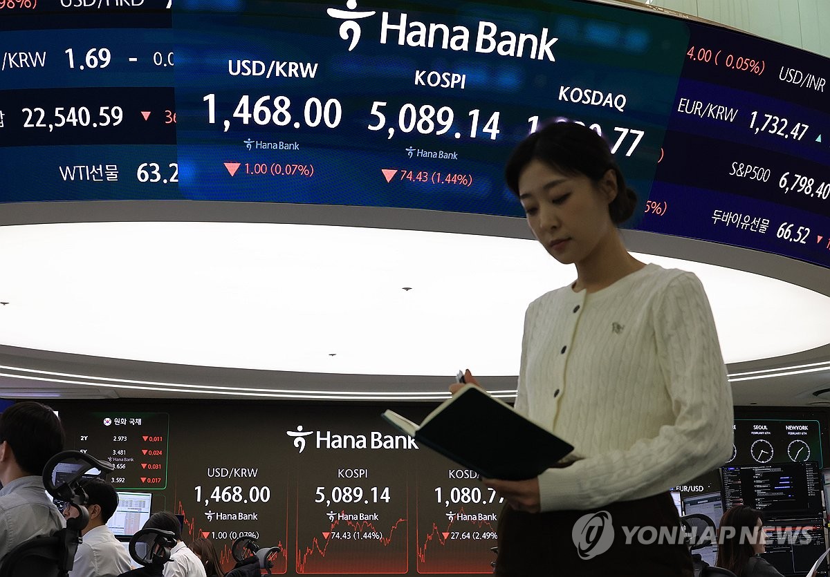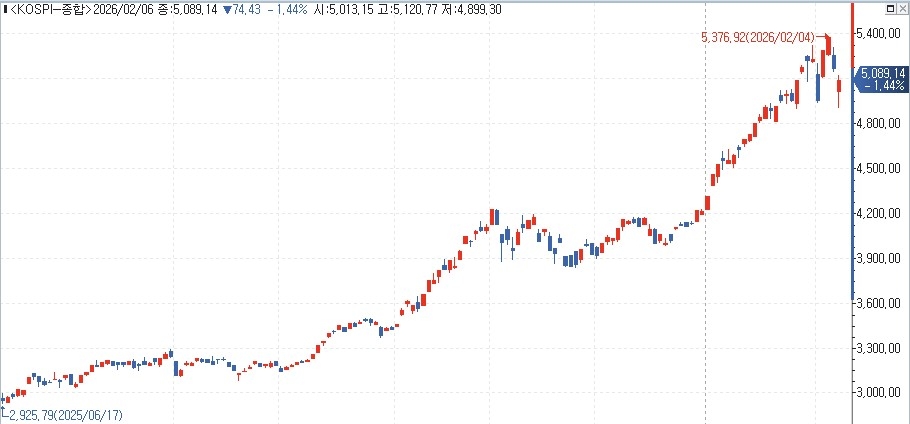 6일 유가증권시장에서 코스피는 전날보다 74.43포인트(1.44%) 내린 5,089.14로 마감했다.