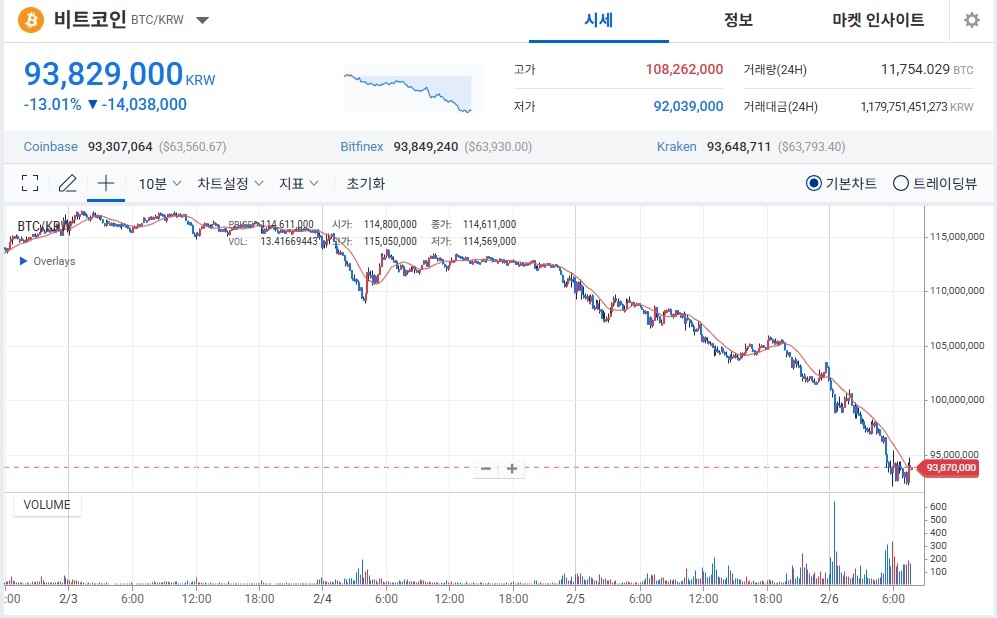 이는 지난 2024년 10월 25일(장중 저가 9천432만원) 이후 최저 수준이다. 그해 11월 초 도널드 트럼프 미국 대통령 당선 이후의 상승분을 모두 반납한 셈이다.