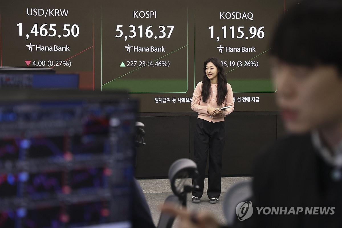 (서울=연합뉴스) 이민영 기자 = 코스피가 9일 미국발 훈풍에 4% 넘게 급등해 5,300대를 회복했다.