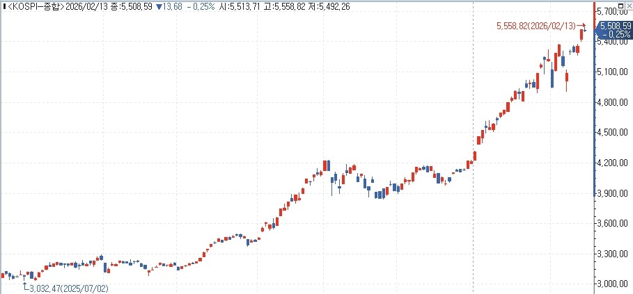 (서울=연합뉴스) 이민영 기자 = 코스피가 설 연휴를 앞둔 13일 미국발 삭풍에도 불구하고 5,540대로 올라서며 역대 최고치를 재차 경신했다.