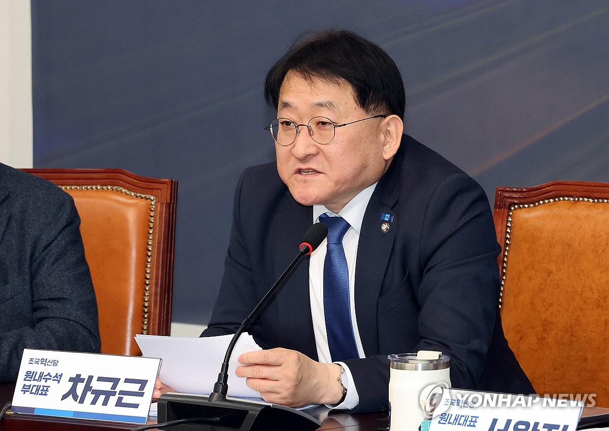 (서울=연합뉴스) 배재만 기자 = 조국혁신당 차규근 원내수석부대표가 10일 국회에서 열린 의원총회에서 발언하고 있다. 2026.2.10 scoop@yna.co.kr