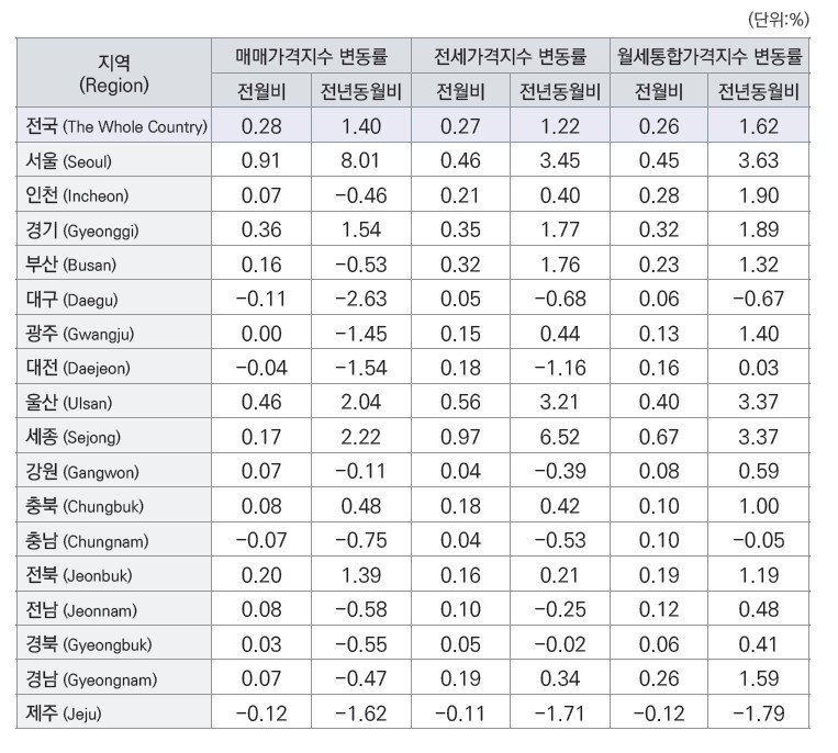 전국 주택종합 매매가격은 0.28% 올라 직전월 대비 상승률이 0.02%포인트 확대됐다.