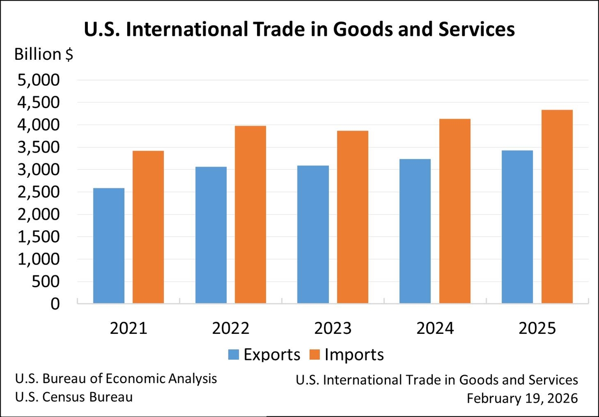 19일(현지시간) 미 상무부 발표에 따르면 2025년 미국의 무역 적자는 총 9천15억 달러로 전년 대비 0.2%(21억 달러) 줄어드는 데 그쳤다.