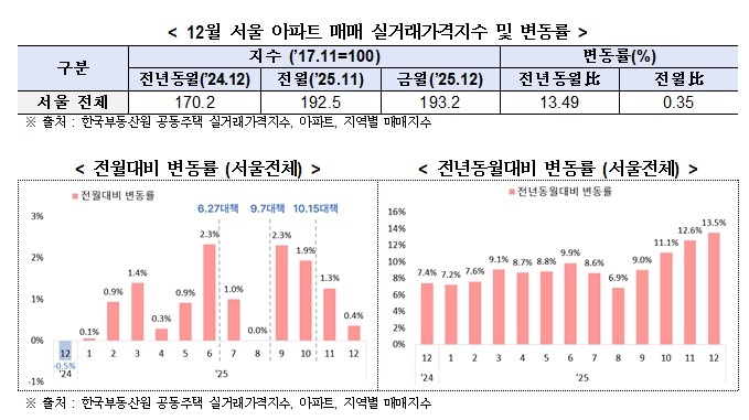 이에 따르면 작년 12월 서울 아파트 매매 실거래가는 전월 대비 0.35% 상승했으며 전년 동월 대비 13.49% 올랐다.