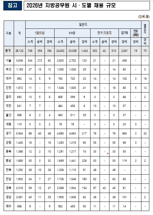 올해 지방공무원 채용은 2만8천717명을 선발한 2022년 이후 최대 규모다. 1만7천665명을 선발한 2025년보다는 1만457명(59.2%) 증가했다.