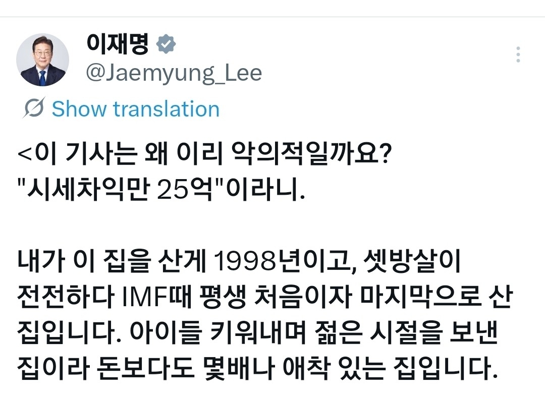 이 대통령은 이날 엑스(X·옛 트위터)에 해당 기사를 링크한 뒤 "개 눈에는 뭐만 보인다는 말이 있다. 내가 부동산 투기를 했다는 이미지를 씌워주고 싶기라도 한 것인가"라며 이같이 말했다.