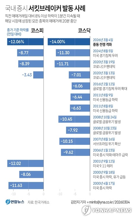 (서울=연합뉴스) 이민영 기자 = 국내 증시가 4일 미국과 이란 간 전쟁 발발 여파로 폭락하면서 각종 불명예 기록도 속출했다.
