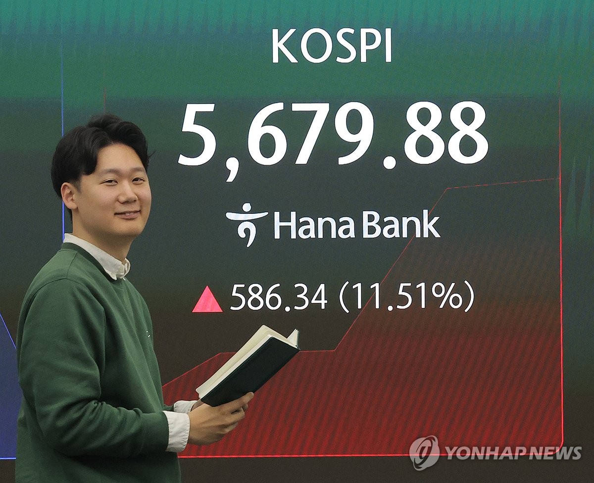 (서울=연합뉴스) 이민영 기자 = 코스피가 5일 장중 10% 넘게 급등해 5,610대를 나타내고 있다. 코스닥지수도 폭등 중이다.