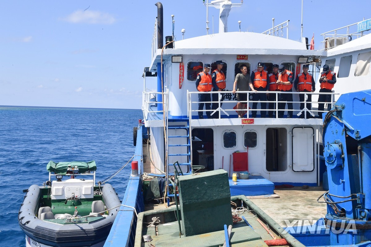 (남중국해 신화=연합뉴스) 2026년 3월 4일 남중국해에서 중국 해경국 소속 순찰반원들이 한 어선을 점검하고 있다. (Xinhua/Mao Jun) 2026.3.14.