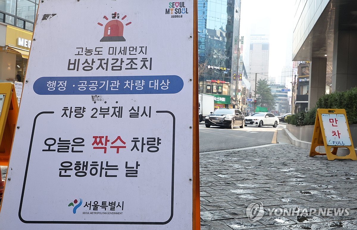 (서울=연합뉴스) 류영석 기자 = 서울시가 미세먼지 비상저감조치를 시행한 17일 서울시청 주차장 입구에 행정·공공기관 차량 대상 2부제 실시 안내문이 설치되어 있다. 2026.3.17 ondol@yna.co.kr